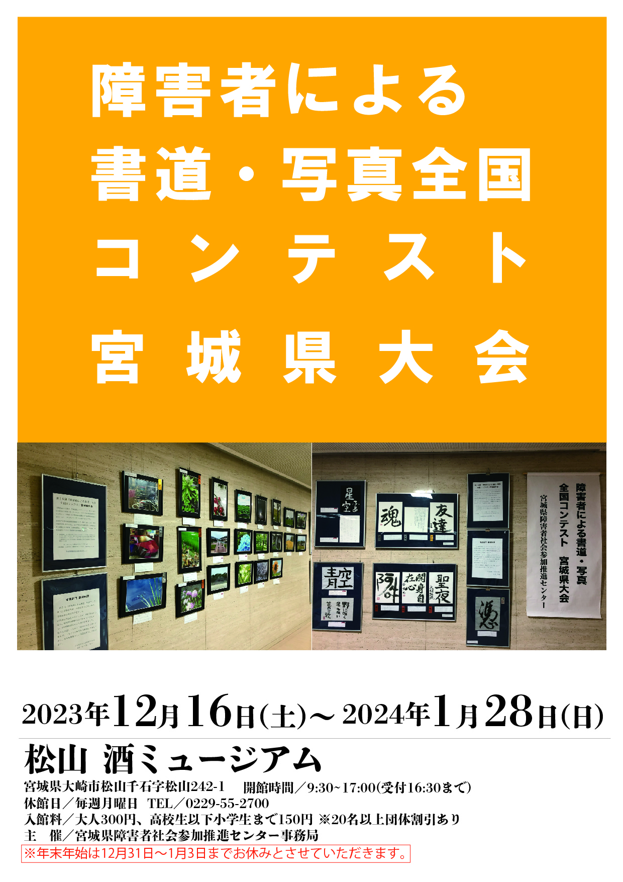 第38回「障害者による書道・写真コンテスト全国コンテスト」宮城県大会の全応募作品199点(書道作品:179点、写真作品20点)の展示を下記日程で開催いたします。